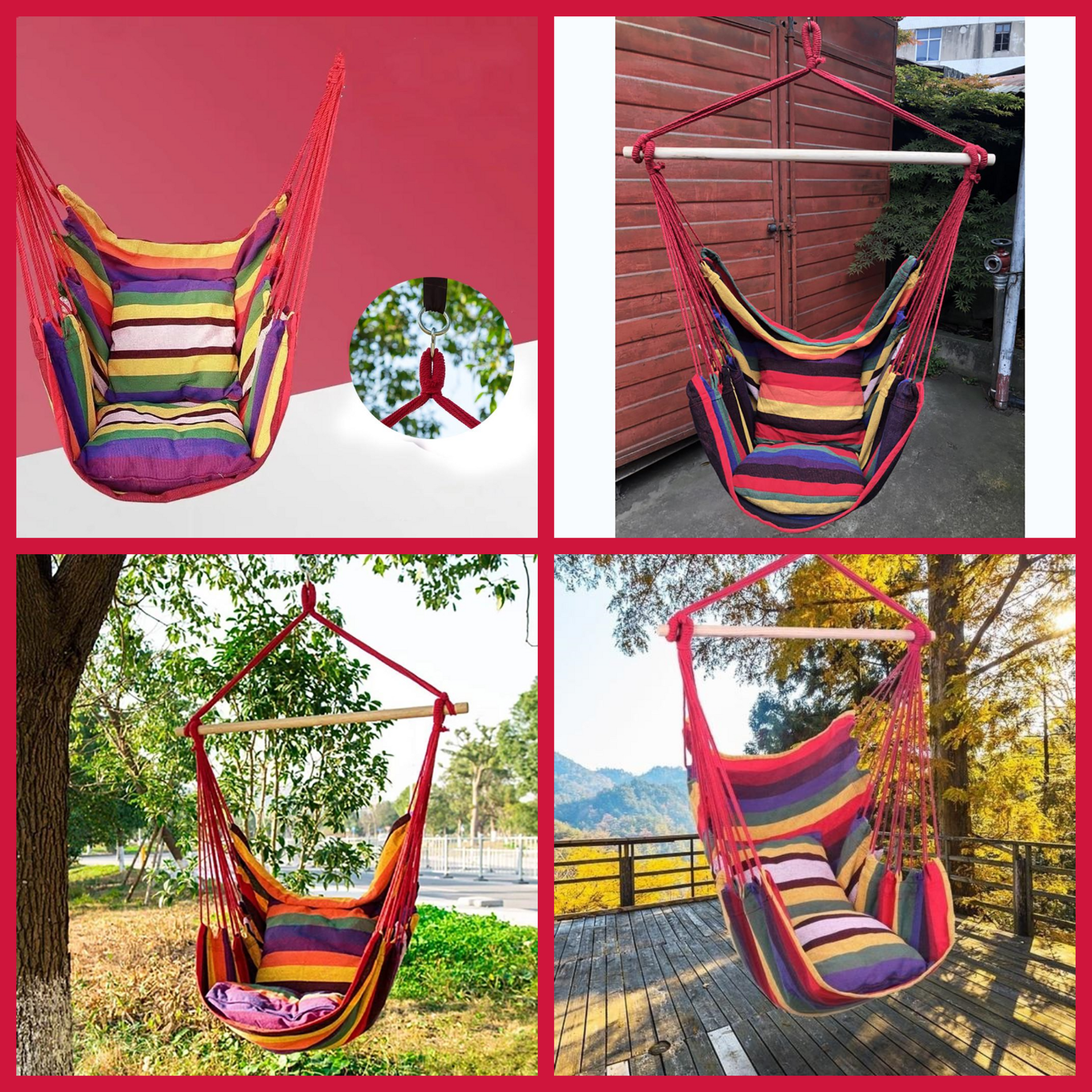 Hamacul tip scaun cu bara de lemn este o piesă de mobilier relaxantă și confortabilă, perfectă pentru a te bucura de momente de odihnă în aer liber.