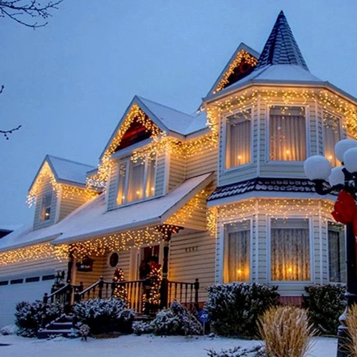 Turturii luminoși dispuși în franjuri creează un efect complex și dinamic, ideal pentru sărbătorile de iarnă.
