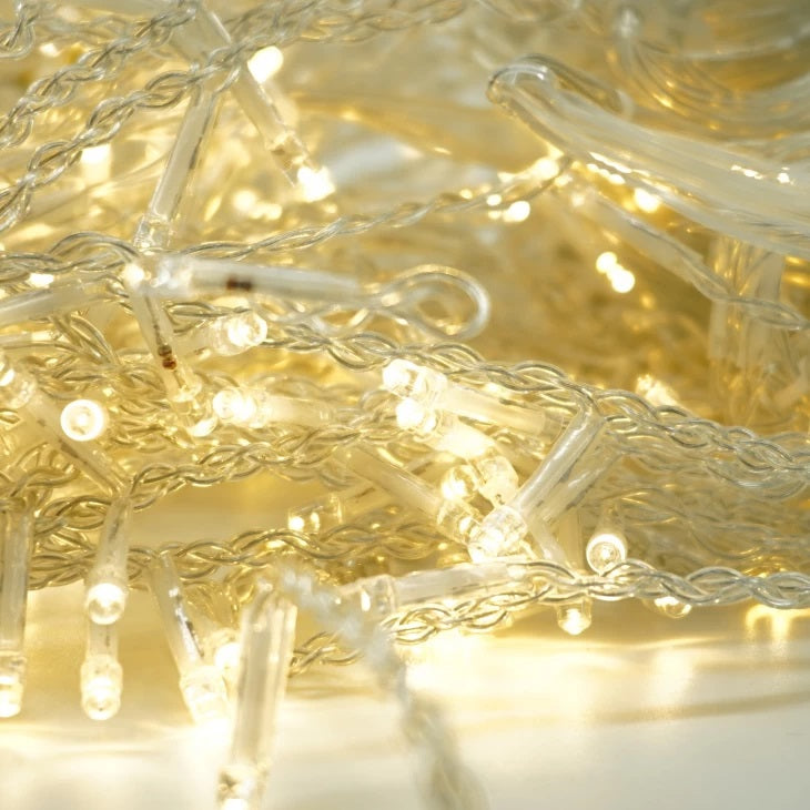 Această instalație de Crăciun de 12 metri cu franjuri și LED-uri în formă de turturi de culoare alb cald este ideală pentru a aduce o atmosferă primitoare și elegantă în decorul de sărbători. LED-urile emulează turturii de gheață și creează un efect de "curgere" a luminii, fiind perfecte pentru decorarea streșinilor, balcoanelor, gardurilor sau ferestrelor.